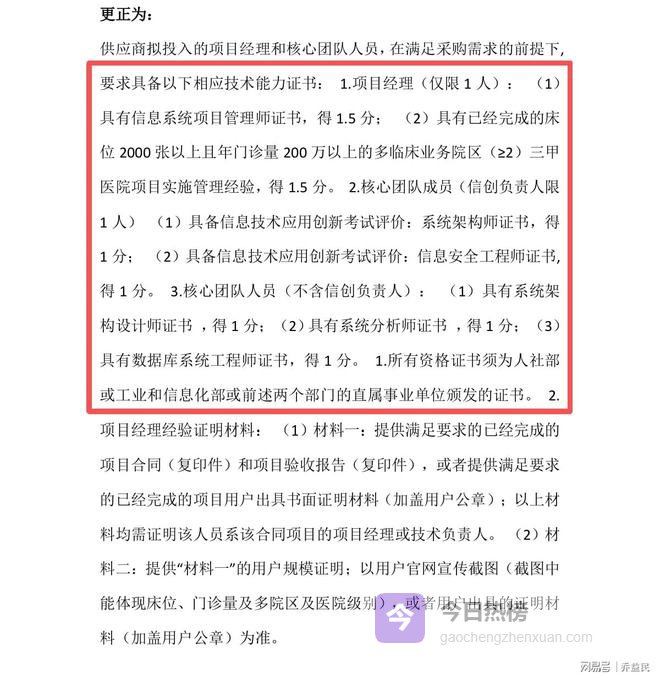 据招标文件《采购需求》披露,本次项目需要完成医院多院区的智慧医院一体化诊疗平台建设。核心内容为门诊业务、急诊业务、住院业务、药学业务、集成平台、数据中心、医政管理等及评级服务支撑等。1月30日,该项目发布第一次更正公告,对采购文件进行调整,同时将开标时间更正为2026年3月4日上午10点。在《附件》中,笔者发现,本次更正涉及共6项内容,其中,在第四项《评标细则及标准,人员配置具体标准和要求》更正内容中,有如下表述:供应商拟投入的项目经理和核心团队人员,在满足采购需求的前提下, 要求具备以下相应技术能力证书:1.项目经理(仅限1人):(1)具有信息系统项目管理师证书,得1.5分;(2)具有已经完成的床位2000张以上且年门诊量200万以上的多临床业务院区(≥2)三甲医院项目实施管理经验,得1.5分。2.核心团队成员(信创负责人限1 人) (1)具备信息技术应用创新考试评价:系统架构师证书,得1分;(2)具备信息技术应用创新考试评价:信息安全工程师证书, 得1分。(3)具有数据库系统工程师证书,得1分。1.所有资格证书须为人社部或工业和信息化部或前述两个部门的直属事业单位颁发的证书。