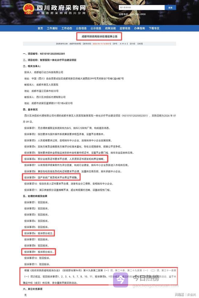 第二起投诉来自成都硅行动力科技有限公司。该公司在提出的11个投诉事项中称,“部分业绩及证书要求不合理,人员资质证书颁发机构界定模糊”、“国产系统厂商及相关平台界定不明确。”2026年4月8日,成都市财政局作出处理结果:上述投诉事项部分成立,成立的投诉事项影响或可能影响采购活动,鉴于未确定中标(成交)供应商,责令重新开展采购活动。