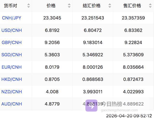 主要经济数据美国核心PCE物价指数在2025年全年上涨2.6%,与通胀目标接近,但2026年3月CPI预期跳升,成为市场焦点。预期已驱动汇率波动:美元兑日元因通胀预期升温一度飙升,但因美联储“不加息”立场明确,涨幅被部分回吐。风险提示日本央行干预风险:若美元兑日元突破160,日本财务省可能动用外汇储备干预,引发日元短期剧烈反弹。美联储政策预期突变:若美国3月CPI数据超预期(>3.5%),市场可能重新押注“更久更高利率”,导致美元短暂反弹。中东局势升级:霍尔木兹海峡若被封锁,油价突破120美元/桶,将引发全球通胀恐慌,人民币可能面临输入性通胀压力,但因资本管制与顺差支撑,贬值幅度或可控。特别国债发行扰动:4月24日1190亿元特别国债发行可能引发国内资金面收紧,间接影响人民币流动性预期,需关注央行对冲操作。重要国际外汇报价