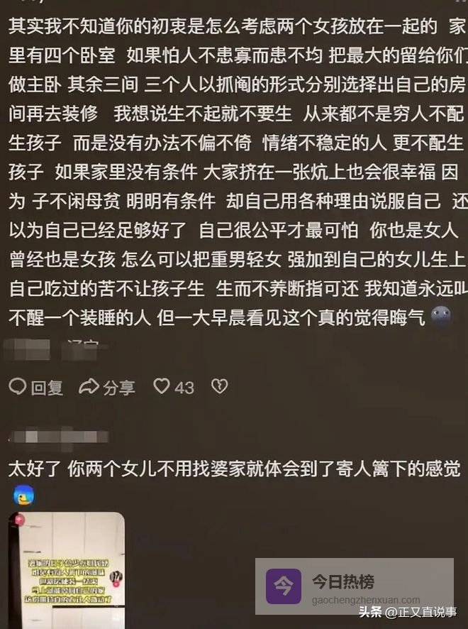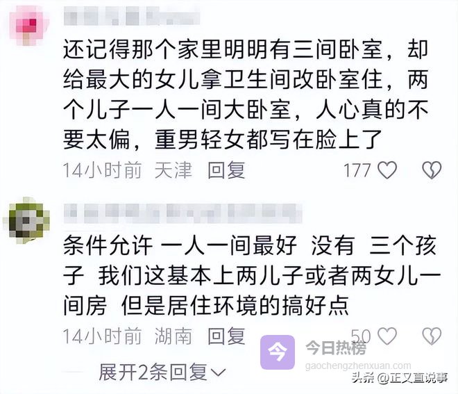 也有观察者直言:3岁幼儿夜间入睡依赖父母安抚属普遍现象,强行赋予其双房配置,远超实际养育所需,而两位女儿却被系统性压缩生存尺度,这种结构性倾斜早已超越“习惯使然”的范畴。