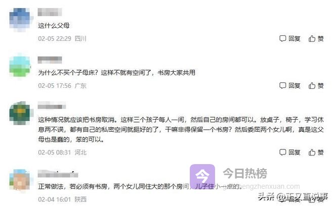 有用户指出:即便保留书房功能,四室仍可满足三人各居一室的基本配置,无需让两位青春期少女持续共用私密空间,资源调配失衡显而易见。
