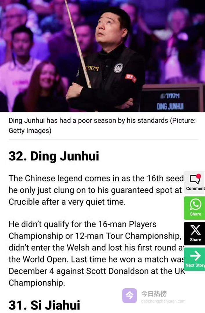 倒数第一! 英国记者给2026斯诺克世锦赛32位选手排状态,直接把咱们的中国一哥丁俊晖摁在了垫底的位置。 更扎心的是,英国专业网站《snookerhq》只给了他1分,满分5分。 一个拿过14个排名赛冠军、曾经世界第一的传奇,怎么就混成了所有参赛者里“最不被看好”的那个?