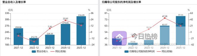 财报显示,公司全年营业收入达316.29亿元,同比增长13%;归母净利润为77亿元,同比增长22%,双双刷新历史纪录。