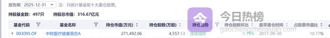 同花顺显示,2025年12月末,持有恒瑞医药的基金数量从2025年9月末的733只减少至497只,持仓总市值从423亿元降至316.7亿元。