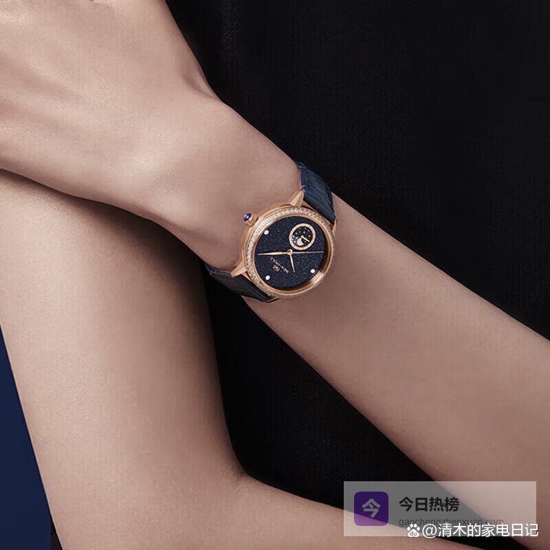 在功能设计上,月相显示是个亮点,能直观看到月亮的盈亏变化,周期大约29.5天,挺适合喜欢看星月的朋友。表盘采用砂金石或贝母材质,带来不同的视觉效果,闪烁的星光点缀或温润的光泽感,还算挺有特色的。