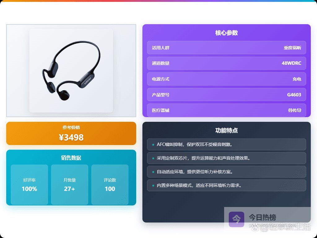 这款助听器最大的特点就是骨传导技术,不用塞进耳朵里,直接通过骨头传递声音,这样耳朵就不会有那种堵住的感觉,戴起来更舒服也更卫生。而且它适用范围还挺广的,不管是中度、重度,甚至部分极重度的听力损失都能用。