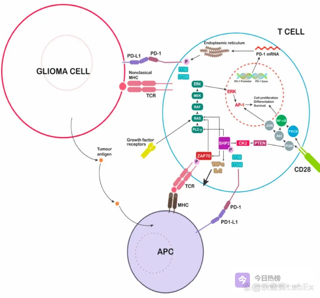 PD-L1可由多种细胞表达,包括肿瘤细胞、抗原呈递细胞(APC)、B淋巴细胞及组织实质细胞。其与T细胞表面PD-1受体结合后,可募集并激活酪氨酸磷酸酶SHP-2,进而导致T细胞受体下游信号分子Zap70的去磷酸化(图1所示)。该信号传导过程最终抑制T细胞增殖与细胞毒性功能,并可能诱导T细胞凋亡或失能,从而在局部微环境中发挥免疫抑制作用。