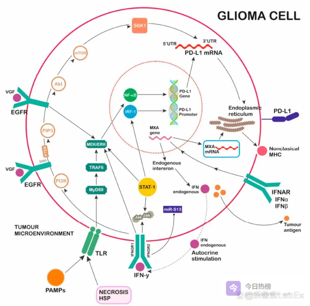 研究系统阐述了GBM肿瘤微环境中PD-L1表达上调的多条关键分子通路及其生物学效应: