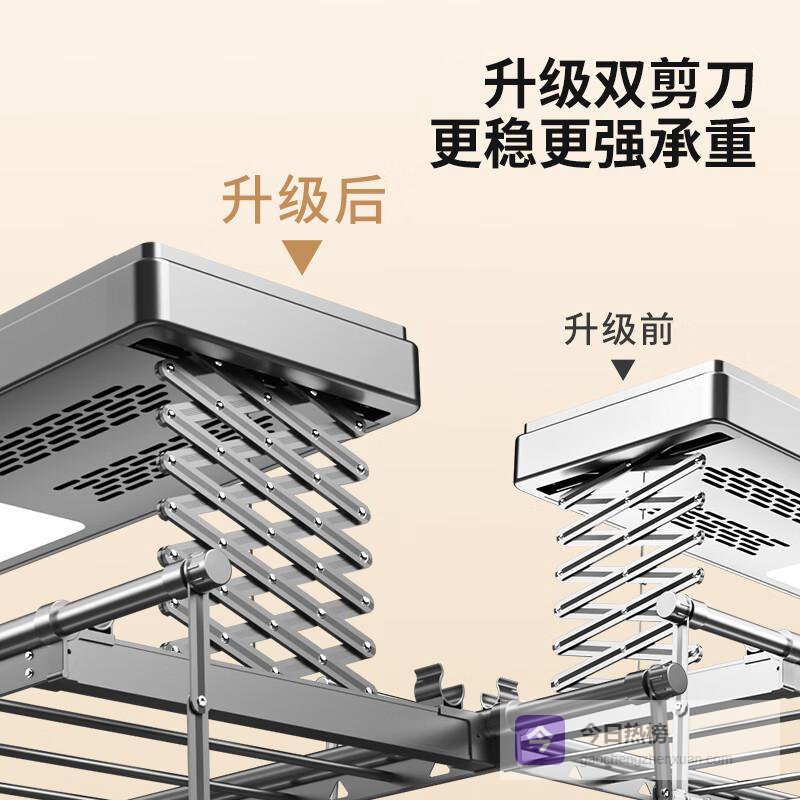 全新的升级双剪刀架结构,不仅稳固提升了整体耐用性,更有效避免晾杆抖动问题。随配内置LED照明灯,即使在光线不足的环境中,操作也毫无困难,为你的晾晒时光增添更多舒适体验,让阳台成为一个温馨的空间。