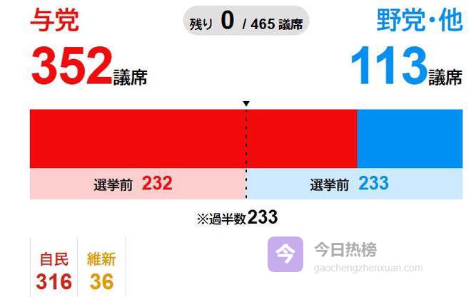 根据日本广播协会(NHK)报道,9日早,全部席位已确认:自民党已经赢下众议院2/3席位(310席)以上的316席,自民和维新两党组成的执政联盟拿下352席。