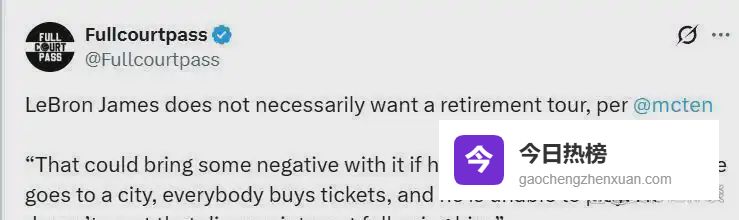 詹姆斯的退役倒计时似乎并未按预设剧本推进。 湖人记者戴夫在湖人对阵骑士的赛前报道中透露,詹姆斯对退役巡演的态度异常冷静,甚至倾向于放弃这一盛大仪式。詹姆斯团队担忧,若因身体负荷管理或突发伤病导致某些场次缺席,球迷高价购票却无法看到他登场,反而会引发负面舆论。 这种“不想让球迷失望”的务实心态,与其职业生涯一贯的谨慎风格相符。