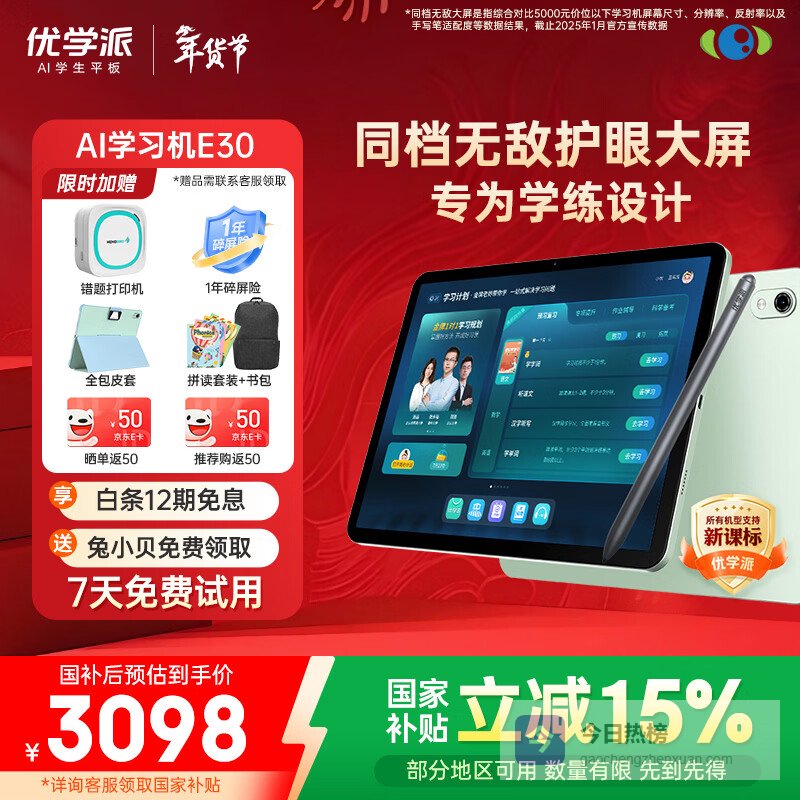 选购建议:如果你正在寻找一款能够陪伴孩子学习成长的学习机,那么优学派E30绝对是你的不二之选。它不仅拥有学习机、学练机、家教机、阅读机四大功能,还配备了优学派五步作业法,养成自主学习习惯,受益终身。8000mAh大电池,强劲性能,持久续航,状态时刻满格。这么强大的学习伙伴,你还在等什么呢?