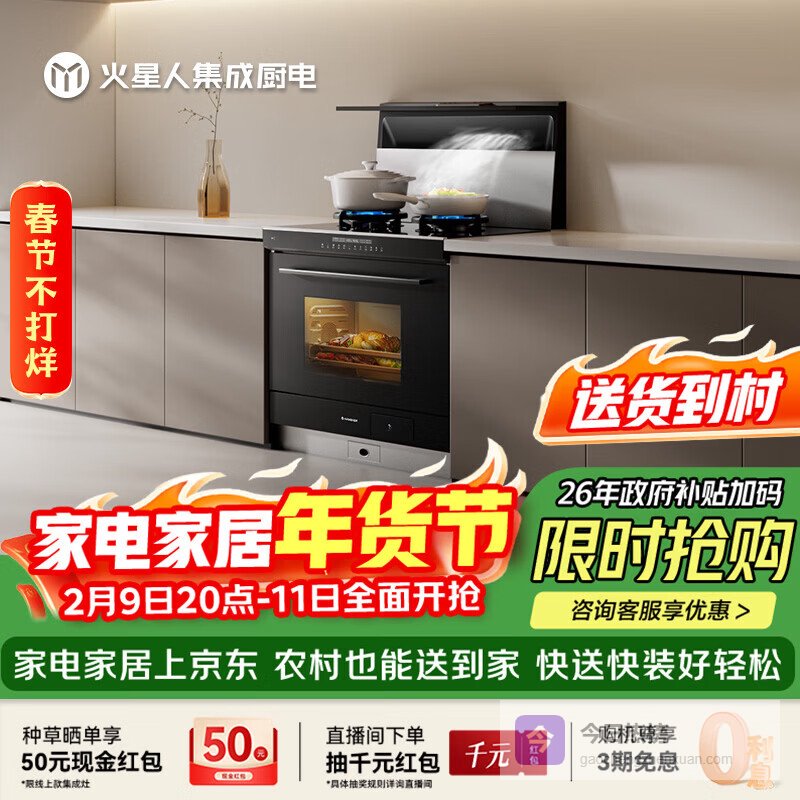【京东自营】火星人集成灶ET36BC25风量/1100Pa蒸烤消炸集成灶一体式天然气右排烟油烟机集成¥