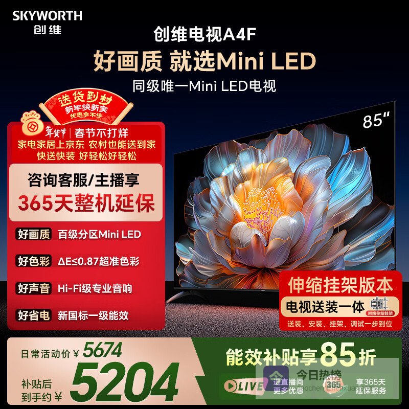 创维电视85A4F 安装版【伸缩挂架送装一体】85英寸电视机miniled 144Hz高刷2+64G¥