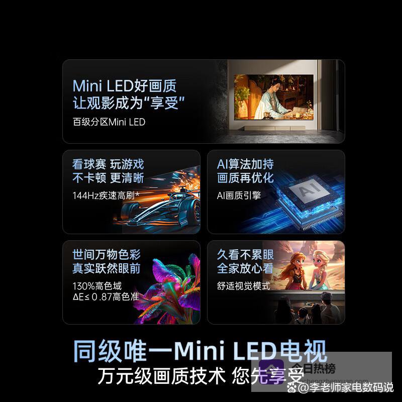 想要高端范儿又省预算的看这里!国家补贴直接省15%真金白银,Ultra黑晶屏显色比普通屏鲜艳30%,看《流浪地球3》冰川特效时连冰晶反光都清清楚楚。Miniled背光搭配AI光翼壁画功能,追剧时自动切换氛围光效,晚上关灯看电影浪漫值拉满。包安装服务对装修党太友好,墙面不用留线槽,装完客厅立马变画廊!