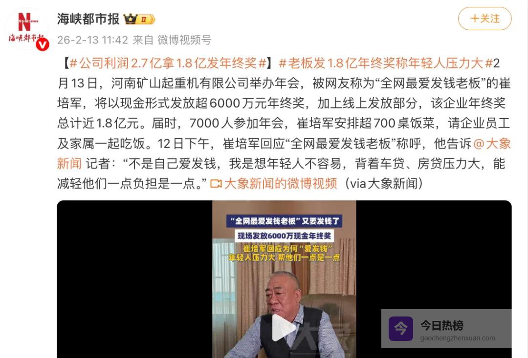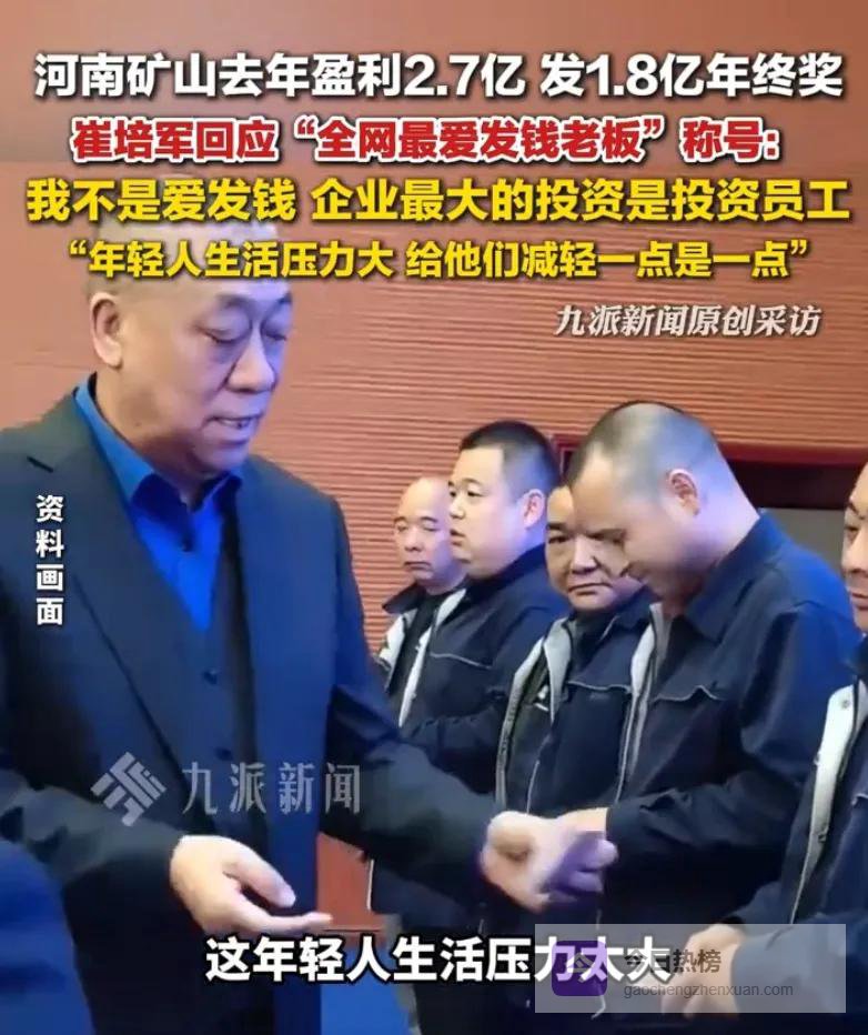 河南“最爱发钱老板”崔培军表示,今年公司利润2.7亿,拿1.8亿发年终奖,并称打到卡里是冰冷冷的数字,年会发钱会更热闹,同时他还表示:不是自己爱发钱,我是想年轻人不容易,背着车贷、房贷压力大,能减轻他们一点负担是一点。由此可以看出这位老板非常关心员工,知道基层员工的不易,难怪会被称为“全网最良心老板”。