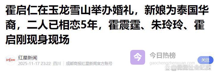 信息来源:红星新闻——霍启仁在玉龙雪山举办婚礼,新娘为泰国华裔,二人已相恋5年,霍震霆、朱玲玲、霍启刚现身现场