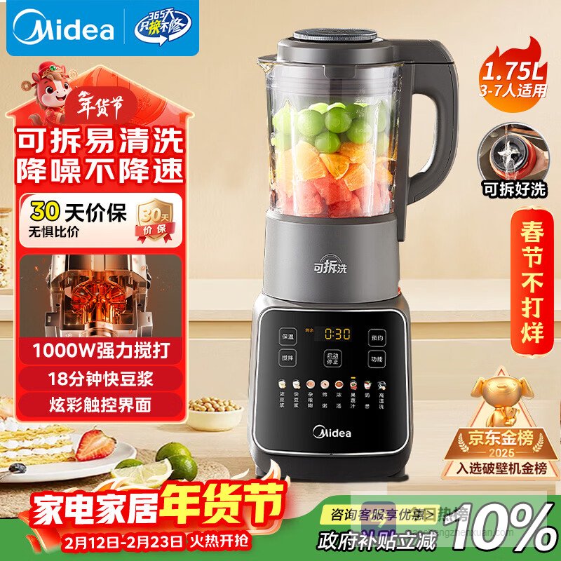 【京东自营】美的破壁机家用自清洗全自动免煮多功能可拆洗豆浆机降噪安睡辅食机1.75L五谷杂粮3-5人¥