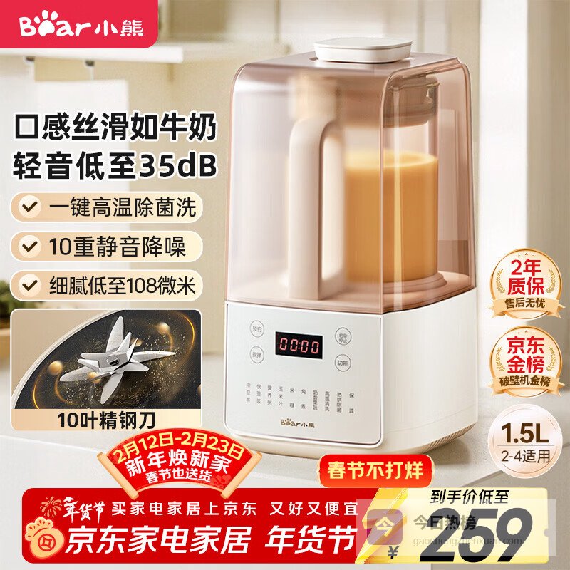 【京东自营】小熊低音降噪破壁机1.5L家用全自动豆浆机榨汁料理辅食机预约多功能破壁免滤3-4人用F0¥