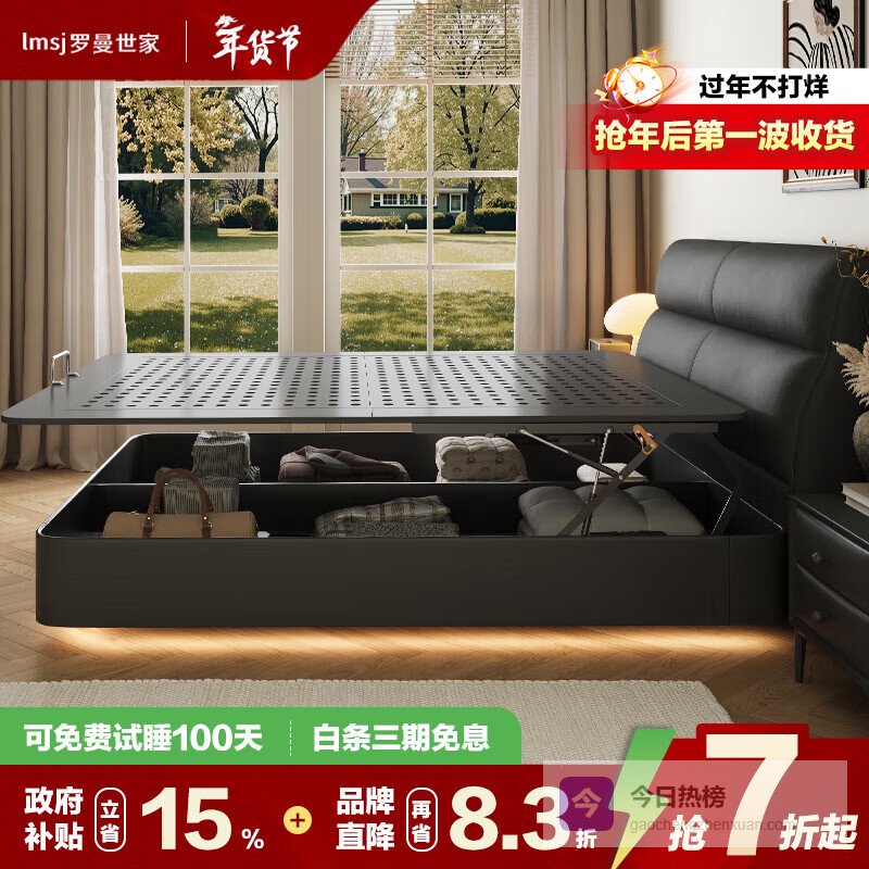 罗曼世家意式极简真皮床碳素钢床悬浮高箱床主卧双人收纳储物床气压高箱床 碳素钢真皮高箱床+天丝乳胶床垫 1800*2000mm¥