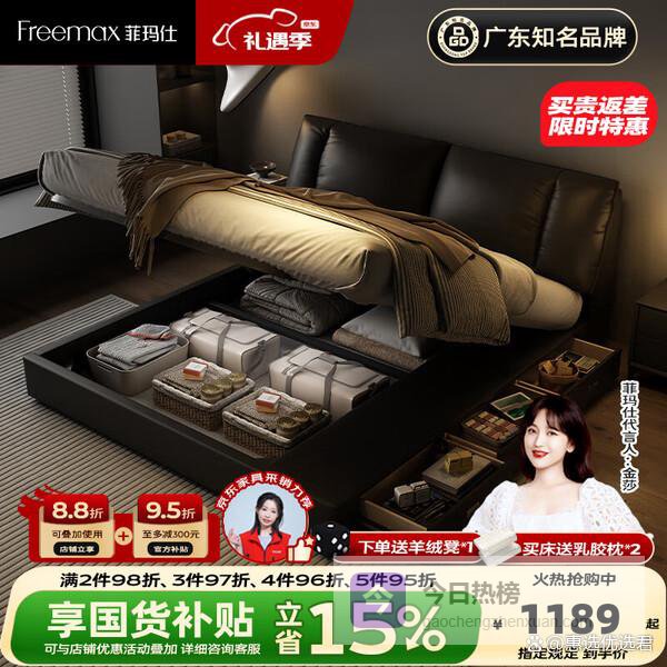推荐理由:这个罗曼世家高箱床用的碳素钢材质,保证了整体的稳固性和耐用性,倒是挺靠谱的,睡上一晚上也不用担心摇摇晃晃。它还设计了一个超大高箱储物空间,可以放衣服、被褥什么的,很实用,帮你解决卧室的收纳烦恼。