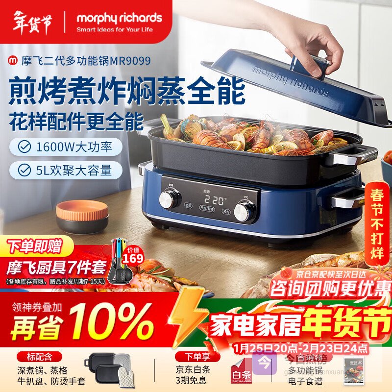 摩飞电器(Morphyrichards)二代多功能锅 家用电火锅电煮锅电蒸锅火锅锅5升大容量分体式预约蒸煮一体不沾煎烤料理锅MR9099蓝