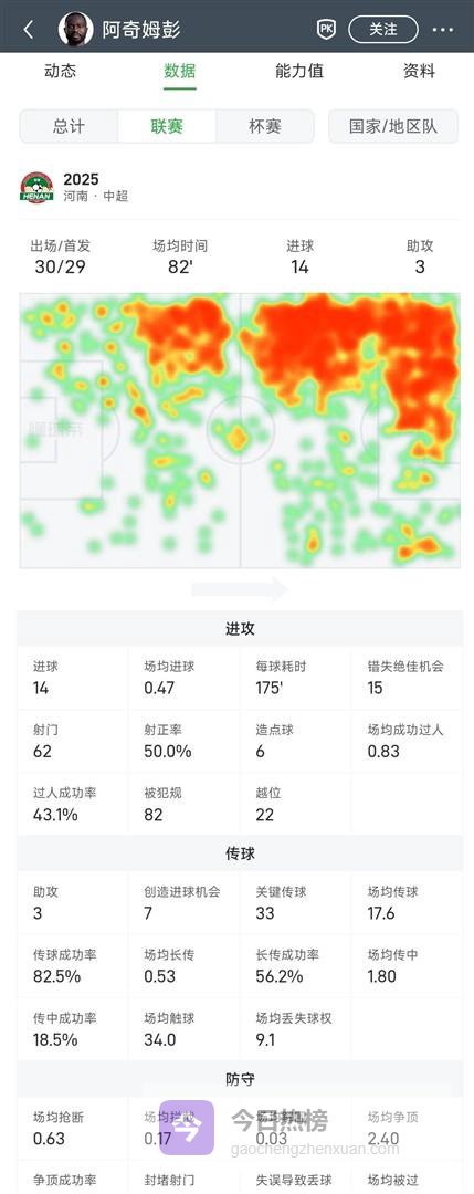 从2017年夏天第一次踏上天津奥体中心的草坪算起,阿奇姆彭在中超已经摸爬滚打了八年。 这八年里他换过三支球队,经历过保级的煎熬,也品尝过足协杯夺冠的喜悦。 去年在河南队,他在30场联赛里攻入14球,还送出3次助攻,对一个即将年满33岁的老将来说,这份成绩单足够亮眼。