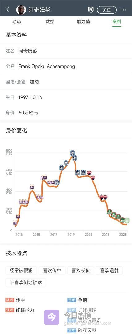 大连英博把目光投向阿奇姆彭,很大程度上是看中了他的实战价值。 上赛季结束后,球队教练组复盘了每一场失利,发现边路爆破能力始终是个硬伤。 有速度的球员传球欠火候,能传球的又突不进去。 技术总监翻遍了国内外球员资料库,最后把手指点在了阿奇姆彭的名字上。