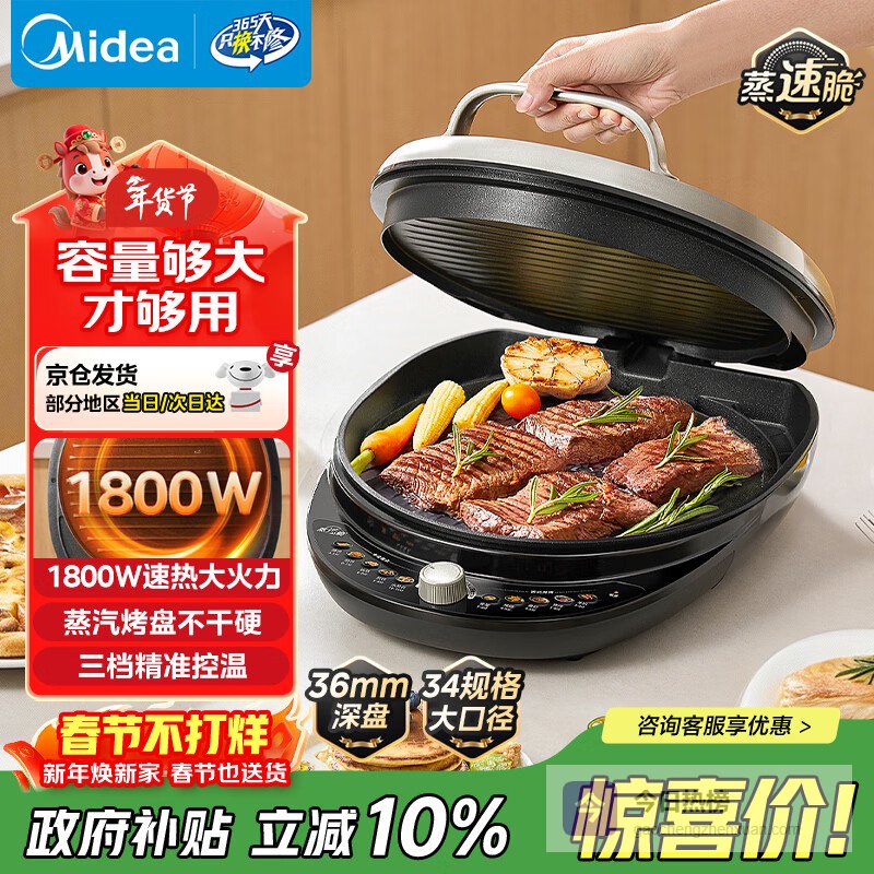 【京东自营】美的电饼铛家用双面加热煎烤机烙饼锅电煎饼锅34大口径加大加深烤盘温度可调烤肉早餐机电饼档¥