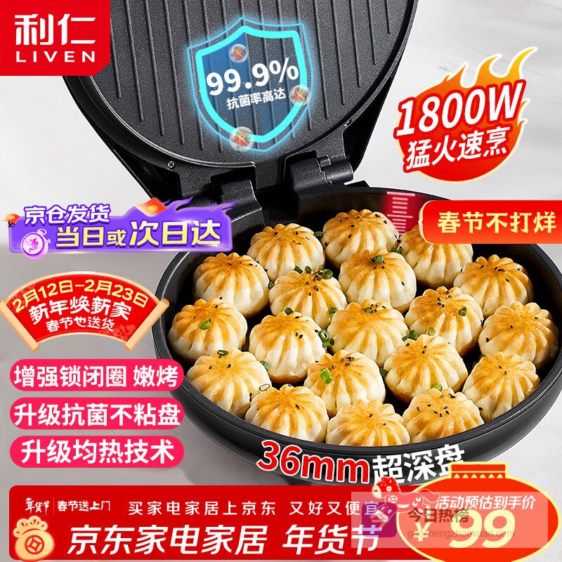 【京东自营】利仁电饼铛家庭用36mm加深1800W大火力双面加热抗菌电饼档烙饼锅煎饼锅烤肉锅三明治早¥