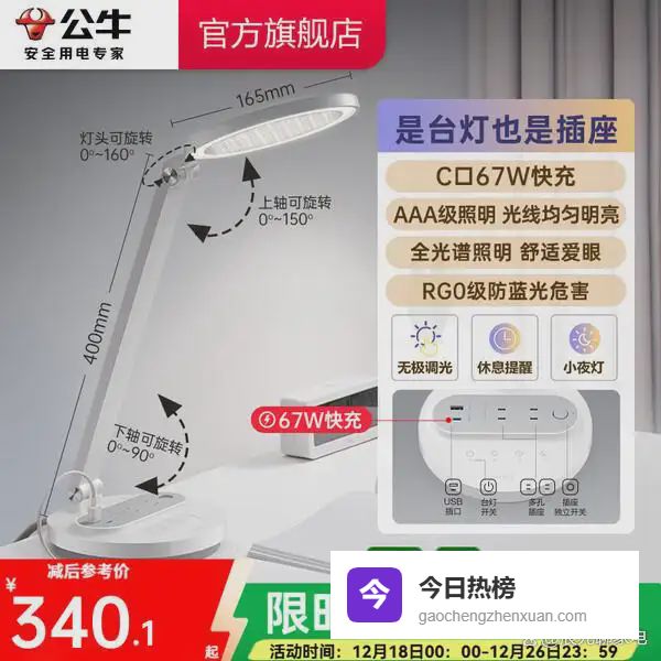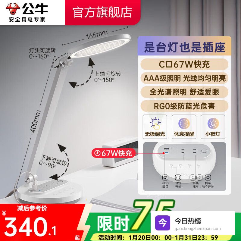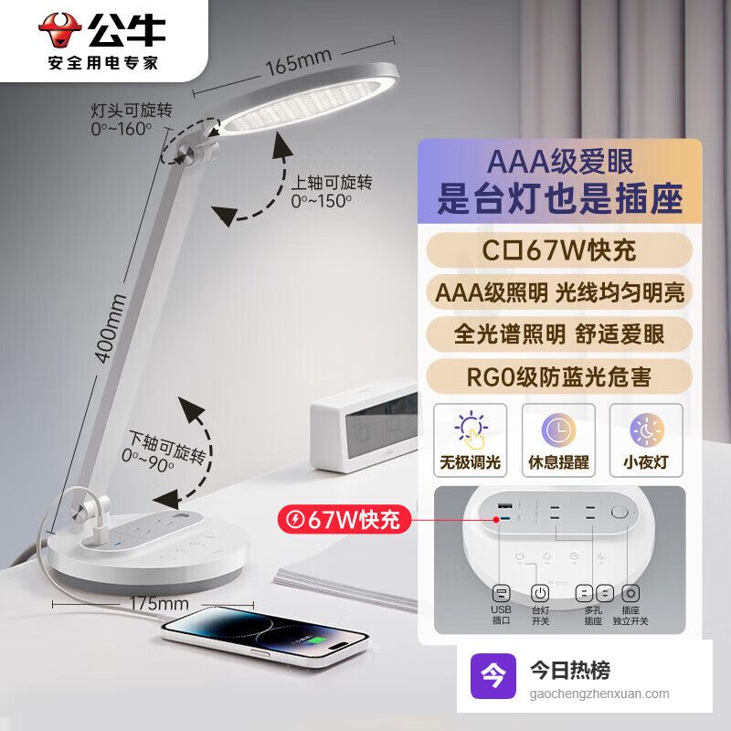 公牛(BULL)67W快充插座台灯 AAA级护眼 防蓝光护视力台灯 卧室宿舍学生儿童学习台灯 无极调光+2位总控¥