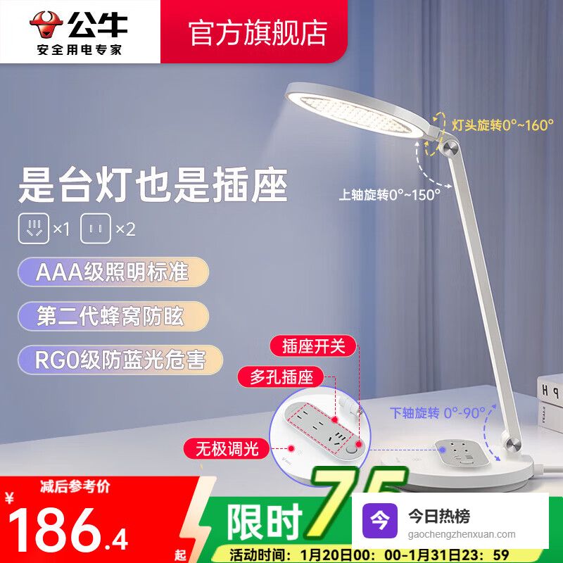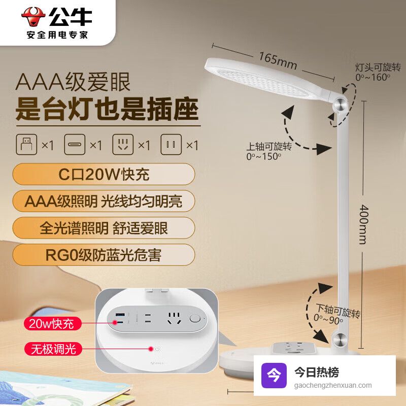 公牛(BULL)20W快充插座台灯 AAA级护眼 防蓝光护视力台灯 卧室宿舍学生儿童学习台灯 无极调光+2位总控¥