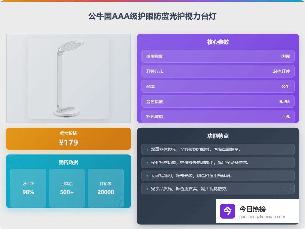 其实,市面上护眼台灯的选择真的很多,价格也参差不齐。我个人觉得,没必要追求特别贵的,选择一款性价比高的,用起来舒服就行。像公牛的台灯,在护眼和实用性上做得都还行,而且价格也比较亲民,所以还是挺值得考虑的。下面给大家挑了7款,感兴趣的可以了解下。