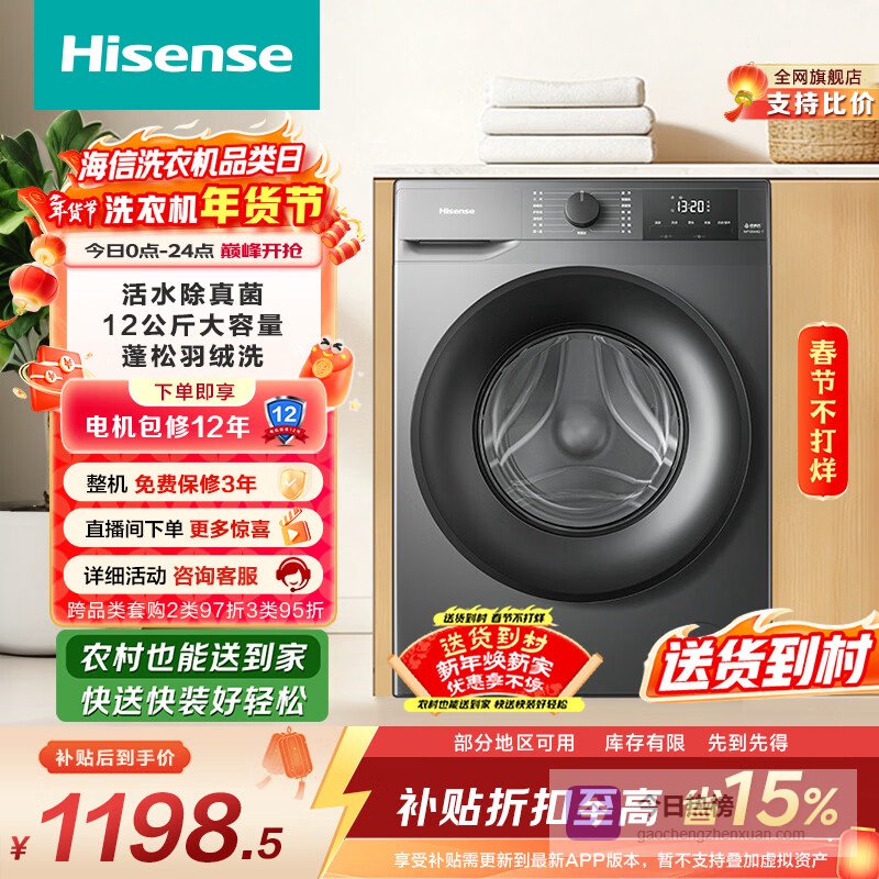 【京东自营】海信全自动滚筒单洗洗衣机12KG超薄高洗净比一级能效出租家用WF120A0Q-7以旧换新¥