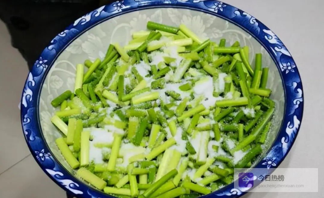 加1大勺食盐,抓匀后静置4–6小时。此时蒜苔会渗出水分,辣味也被淡化,为后续入味打好基础
