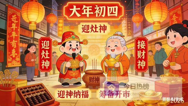 大年初四,核心说法是“迎神纳福、筹备开市”,这一天是“送神”与“迎神”的过渡,也是为后续的拜年、开市做准备,习俗围绕“迎灶神、接财神”展开。