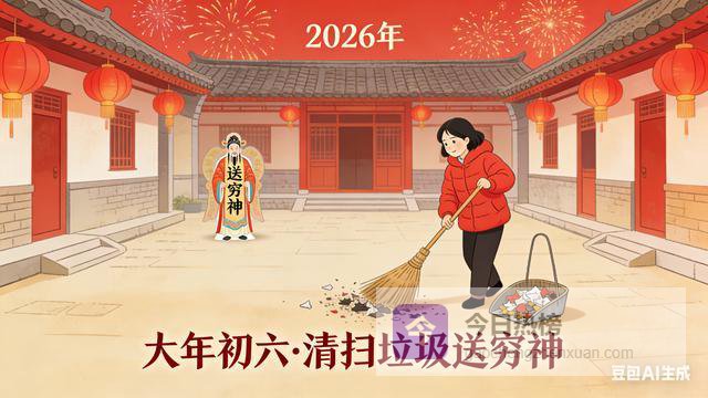 主要习俗:① 送穷:这是初六最重要的习俗,家家户户会彻底清扫家中垃圾,把春节期间积攒的杂物、垃圾全部打包送走,俗称“送穷神”,寓意“送走穷鬼、晦气、灾厄”,祈求来年衣食无忧、生活富足、马到成功;送穷时,要念叨吉祥话,期盼穷神一去不复返。② 启市劳作:商家大多会在这一天正式启市,开始营业,寓意“六六大顺、生意兴隆”;普通家庭也会开始整理家务、准备恢复正常生活,寓意“开启新一年的忙碌,诸事顺利”。③ 拜年收尾:这一天是走亲访友、拜年的最后一天,还未拜访的亲友会在这一天登门拜年,互道祝福,为春节的拜年仪式画上句号。④ 吃面条:部分地区有“初六吃面条”的习俗,寓意“顺顺利利、长长久久”,也寓意“缠住好运,不让福气溜走”。