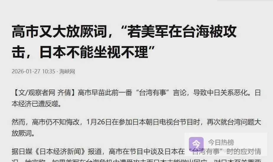 如果不是高市早苗在涉台问题上挑衅,中日关系不会恶化到这个地步。