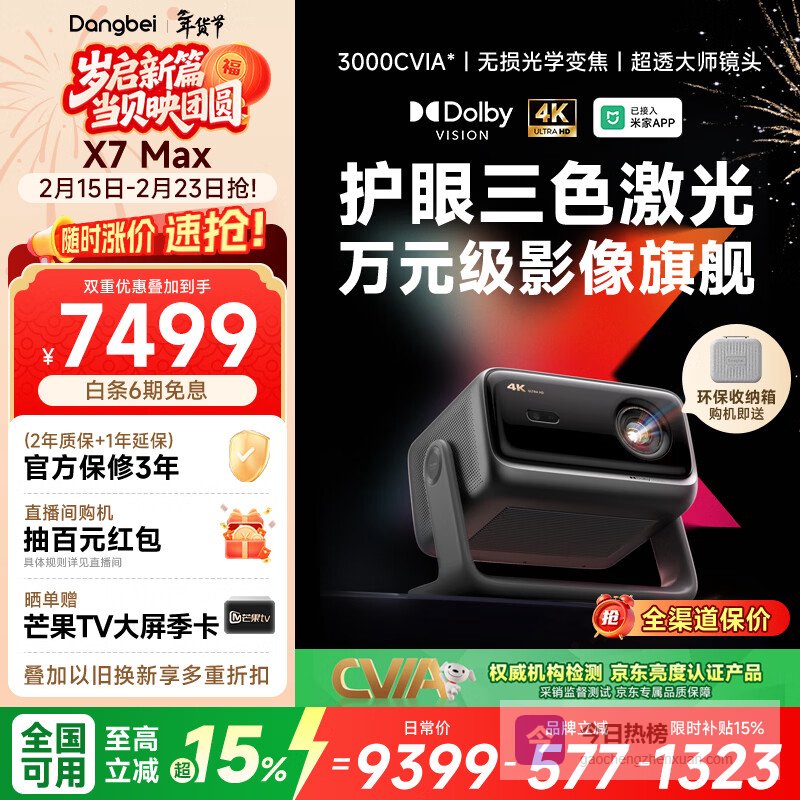 【京东自营】当贝X7Max4K超高清三色激光投影仪家用变焦移轴家庭影院卧室国家补贴¥