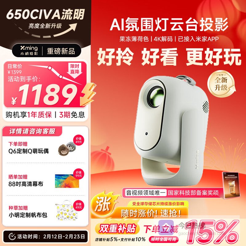 【京东自营】小明Q6高亮版云台投影仪家用高清便携投影机智能家庭影院卧室客厅电视限时补贴¥