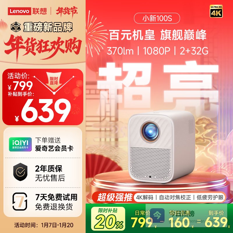 【京东自营】联想2025款小新100S投影仪住宅家用便携投影卧室游戏投影机智能家庭影院手机投屏¥