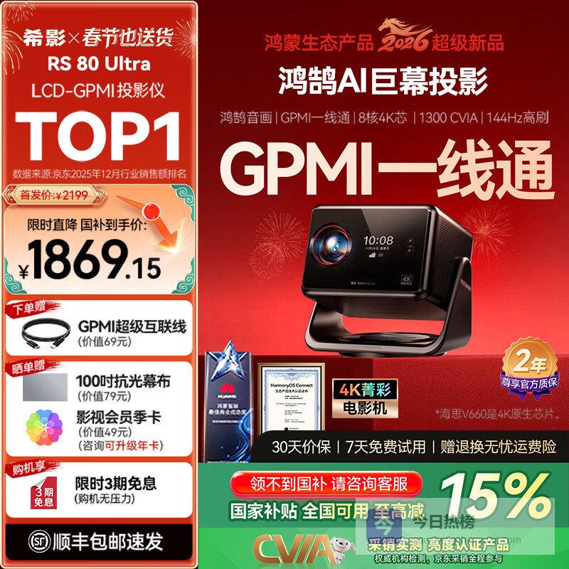 【品牌直营】希影RS80Ultra云台投影仪家庭影院卧室超高亮投影机144Hz高刷鸿鹄音效2.0海思¥