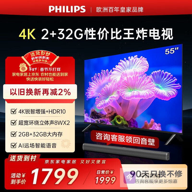 【京东自营】飞利浦经济款55英寸4K超高清智慧全面屏高频调光护眼远场AI语音智能液晶平板电视机55P¥