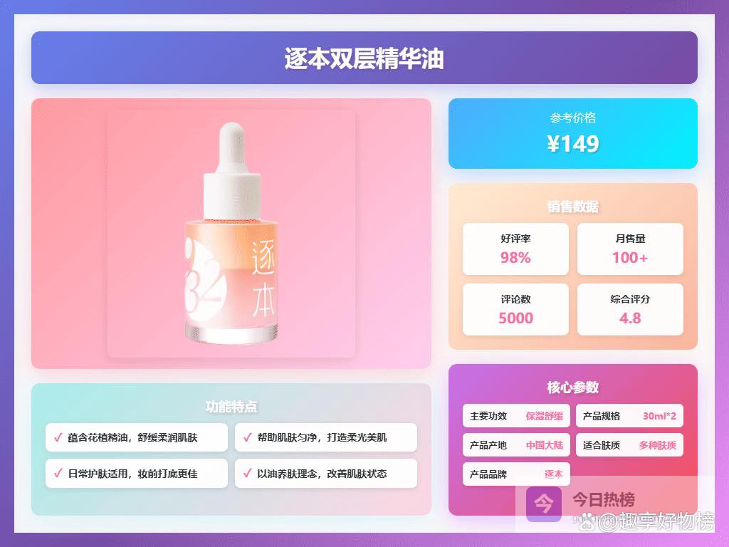 十、逐本① 多效滋养:这款精华油里面融合了保湿、修护、舒缓和滋养的成分,深层滋润肌肤,让肌肤变得更加柔软弹润。不管你是干肌还是油肌,都能找到合适的调理方式,用完后皮肤感觉更加健康有光泽。