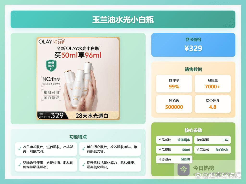 七、玉兰油① 深层补水保湿:这款精华富含甘油成分,能快速渗透到肌肤底层,为肌肤提供源源不断的水分。用完之后,肌肤摸起来特别细腻柔滑,干燥缺水的问题明显改善,感觉肌肤水润亮泽,整天都很舒服。