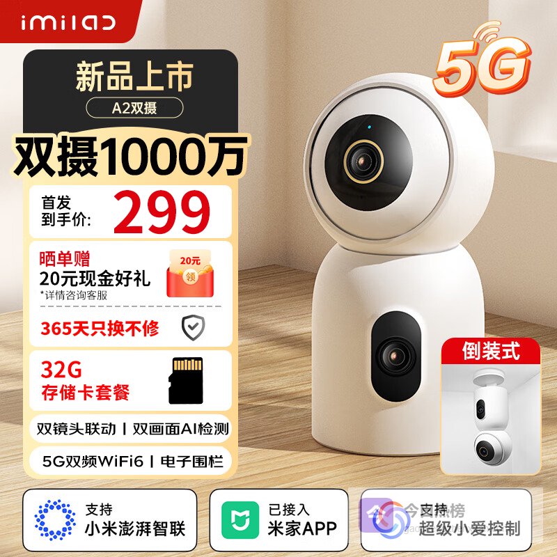 小白接入米家监控摄像头家用监控器360度无死角带夜视全景语音室内家庭手机远程无线高清语音可对话 双摄1000万+5G双频+32G¥