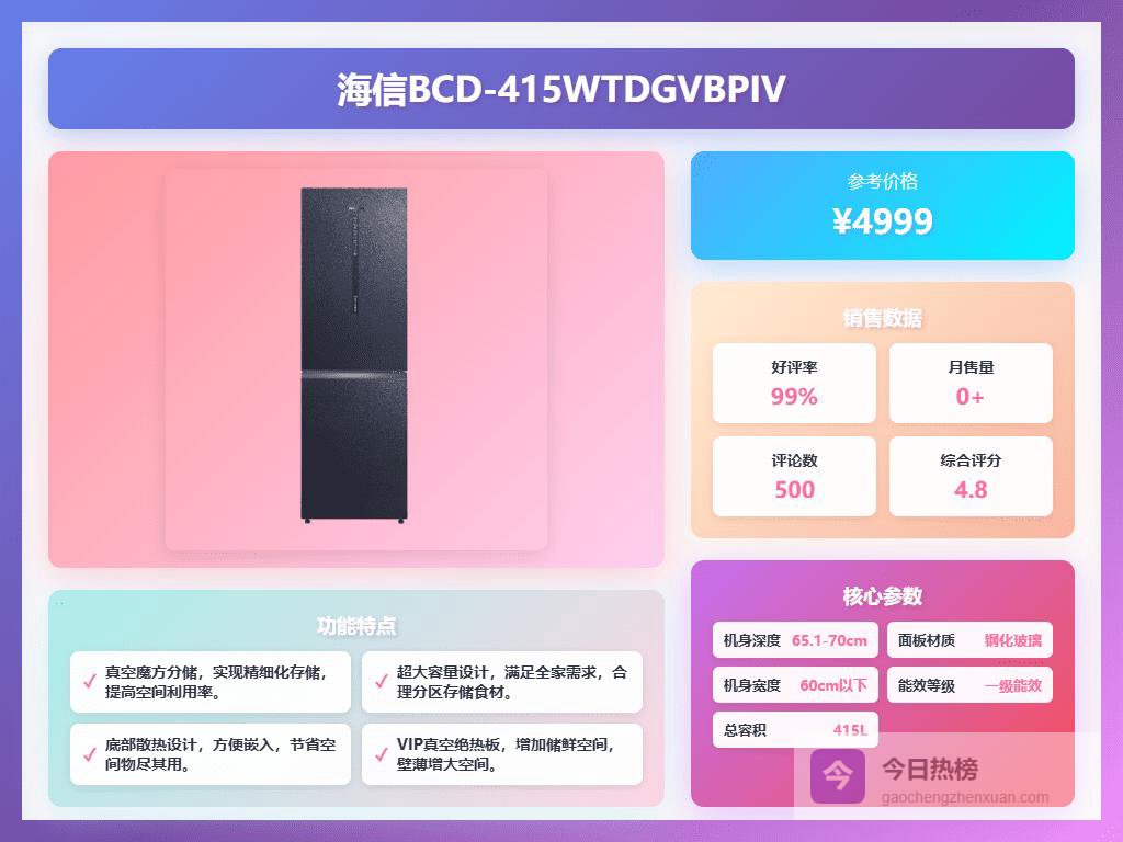 4、海信BCD-415WTDGVBPIV这款海信冰箱采用了真空休眠科技,通过抽走空气形成低压低氧环境,有效抑制微生物滋生,延长食材的新鲜期。全金属风道背板设计,使制冷速度更快、更均匀,水润微风道则确保温差稳定,存储环境更佳。而且,配备多场景交互的AI智能管理系统,支持远程调温和智能组菜,使用起来非常便捷。