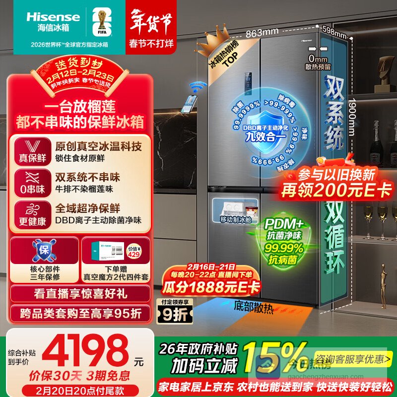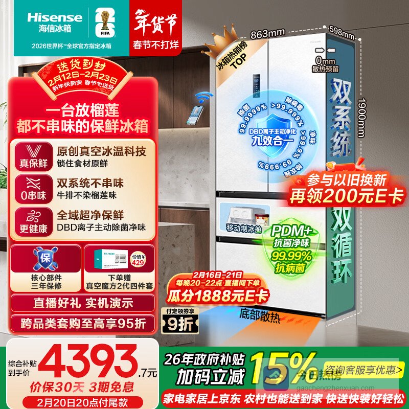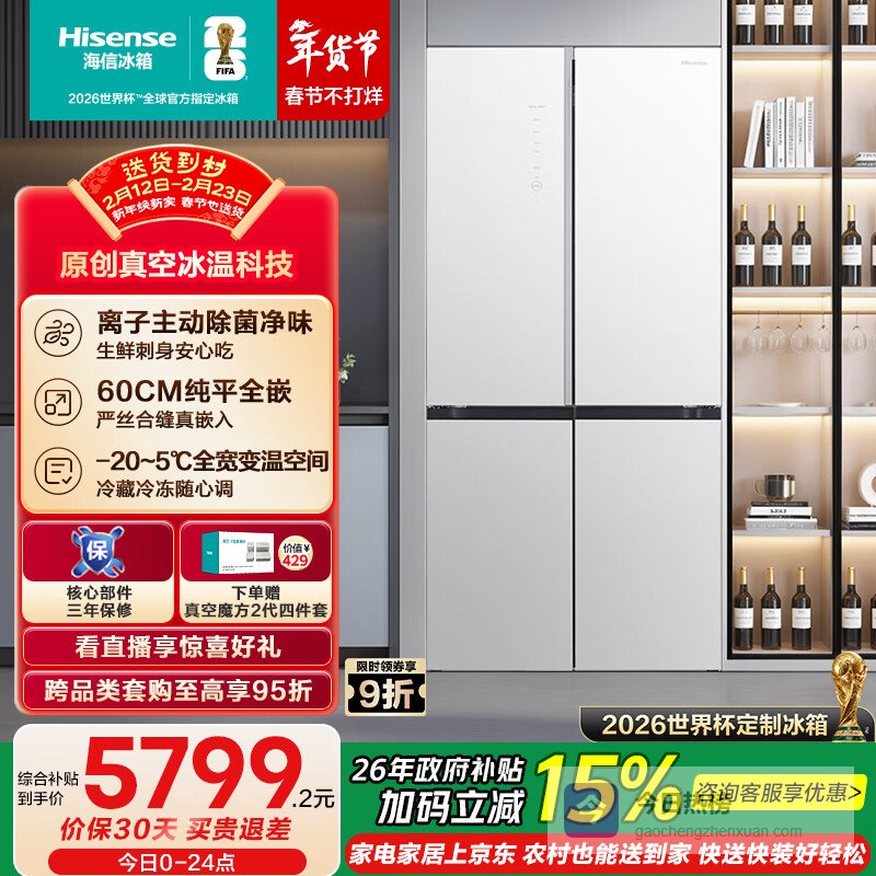 海信璀璨真空510冰箱零嵌入式四开门超薄一级能效风冷无霜国家补贴世界杯定制冰箱BCD-510WTDGVBPIV2¥