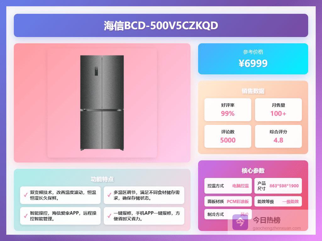 5、海信BCD-500V5FZKQD这款海信冰箱配备了变频风冷制冷系统,确保内部温度均匀稳定,避免温度波动带来的食材变质。其多门设计和大容量,方便分类存储各种食材,尤其适合家庭日常需要。LED显示屏直观显示温控状态,让调节更为便捷。