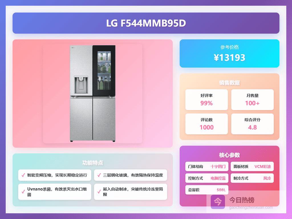 要我说,海信的优势在于价格亲民,同样的预算,你能买到更大容量、更多功能的型号。像海信BCD-611WFK1DPQ这种,不到两千就能拥有600多升的超大空间,对于人口多的家庭来说简直是福音。而且,海信很多型号都搭载了实用的保鲜技术和智能控制,用起来也挺省心。当然,如果你预算充足,LG冰箱在保鲜技术和智能化方面可能更胜一筹。一些高端型号,像LG F544MMB95D,拥有敲敲门、全自动制冰等炫酷功能,用起来的确很方便。